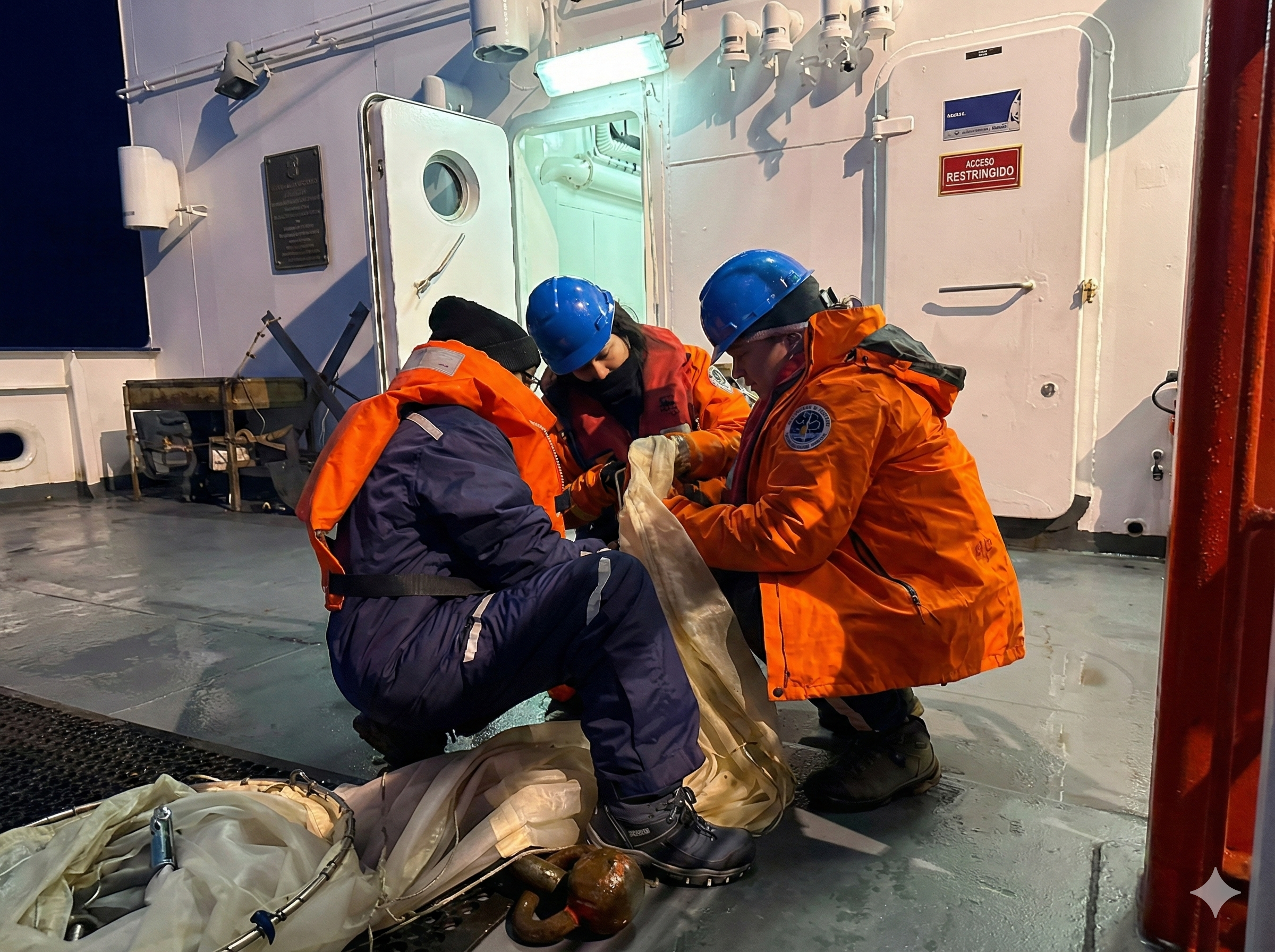 El equipo estuvo liderado por la Dra. Emilce Rombola junto a la bióloga Ludmila Vega (ambas del Instituto Antártico Argentino), y contó con la colaboración de la investigadora junior Mariana Pita, bióloga marina de la Universidad Científica del Sur.
