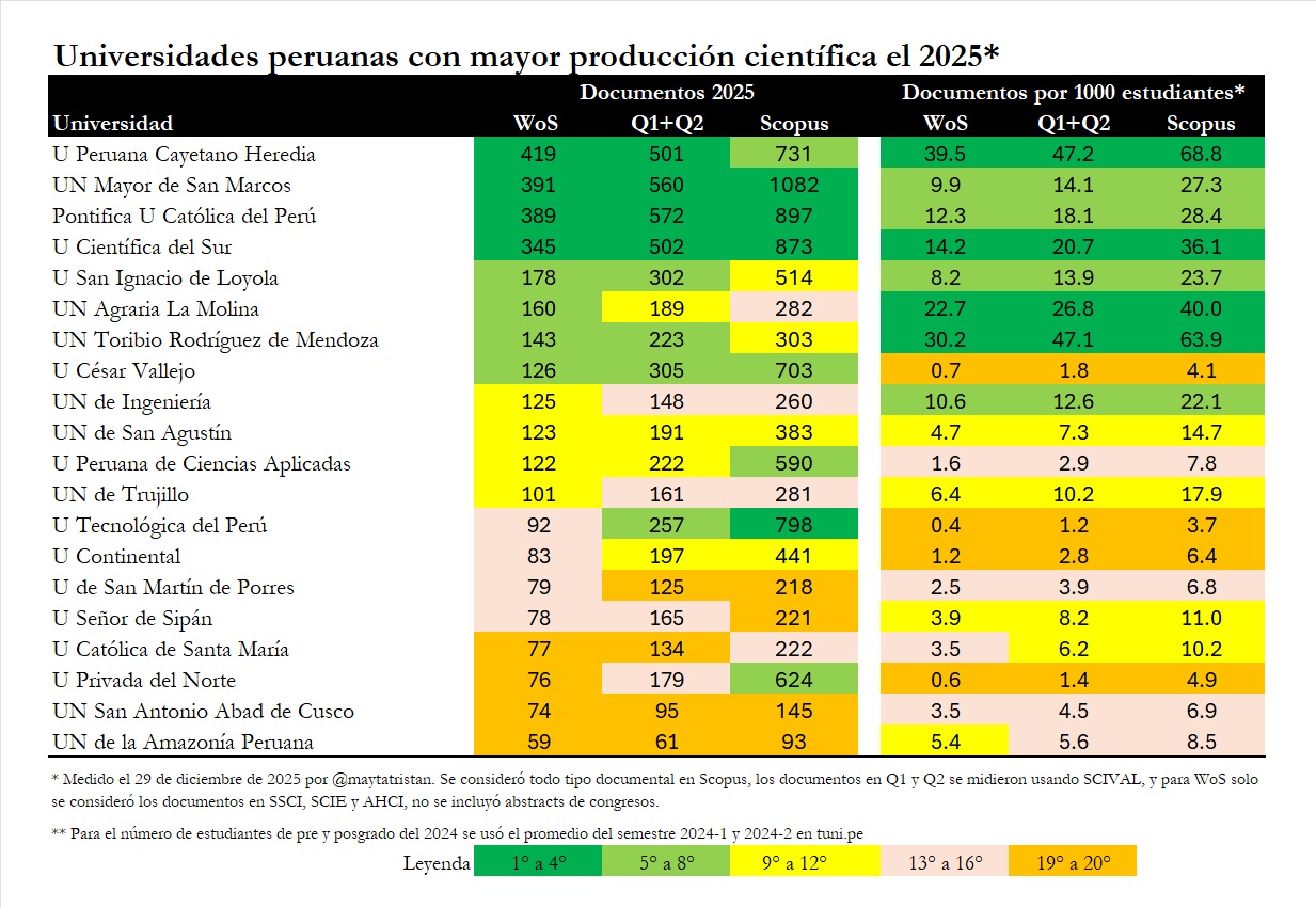 En 2025, la Universidad Peruana Cayetano Heredia (UPCH) se posicionó como la institución con mayor producción científica del país, liderando el número de publicaciones registradas en la Web of Science (WoS). Con 419 documentos, la UPCH recupera el primer lugar en producción científica, superando a la Universidad Nacional Mayor de San Marcos (UNMSM), que encabezó el ranking en 2023 y 2024.